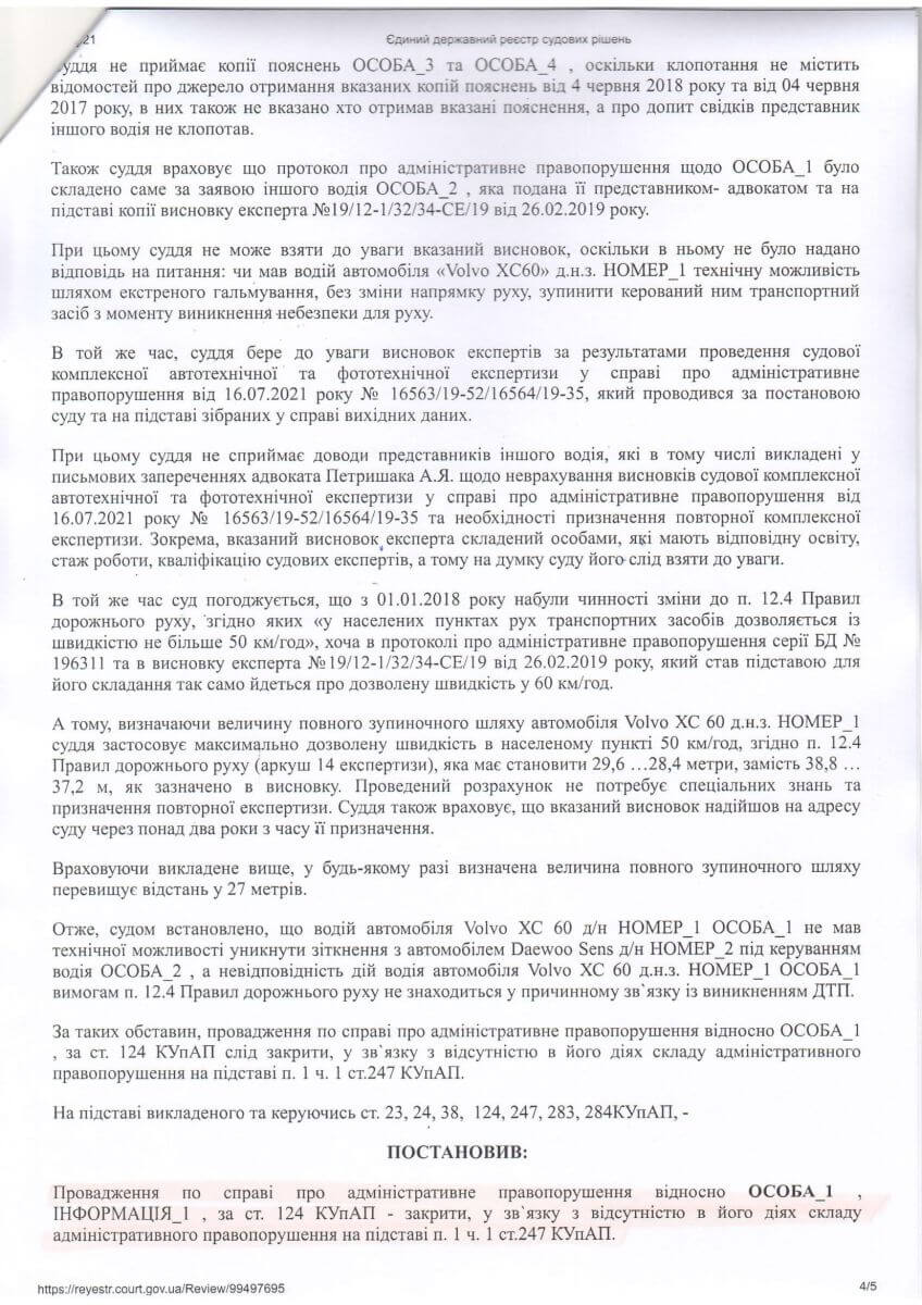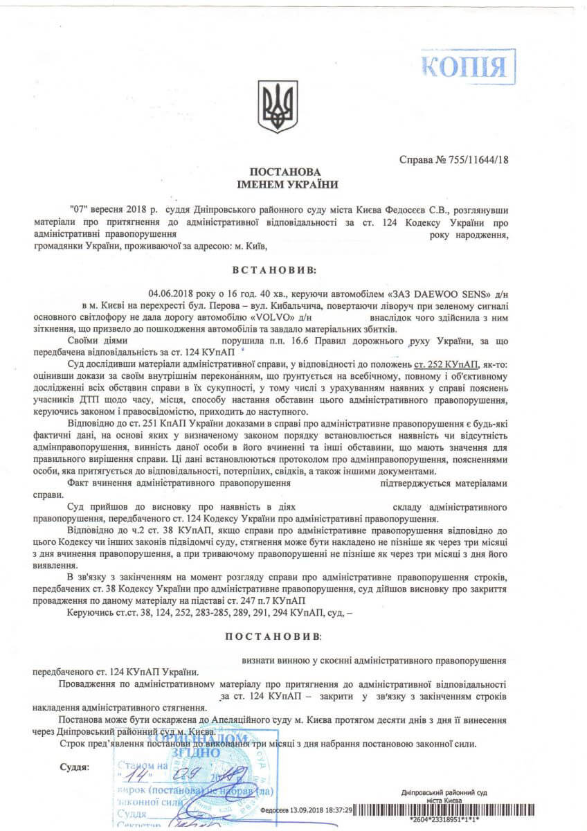 Однако, указанное дело интересно тем, что в марте 2019 года, на основании заключения ДНДКЦ в отношении потерпевшего также составили протокол по ст. 124 КУАП, и данный протокол направлен в Днепровский районный суд г.. Киева, то есть по истечении 1 года после самого ДТП. И в рамках уже этого дела мной обоснованно заявлено ходатайство о проведении автотехнической экспертизы в КНИСЭ, которое установило невиновность водителя автомобиля «Volvo» (потерпевшего).
