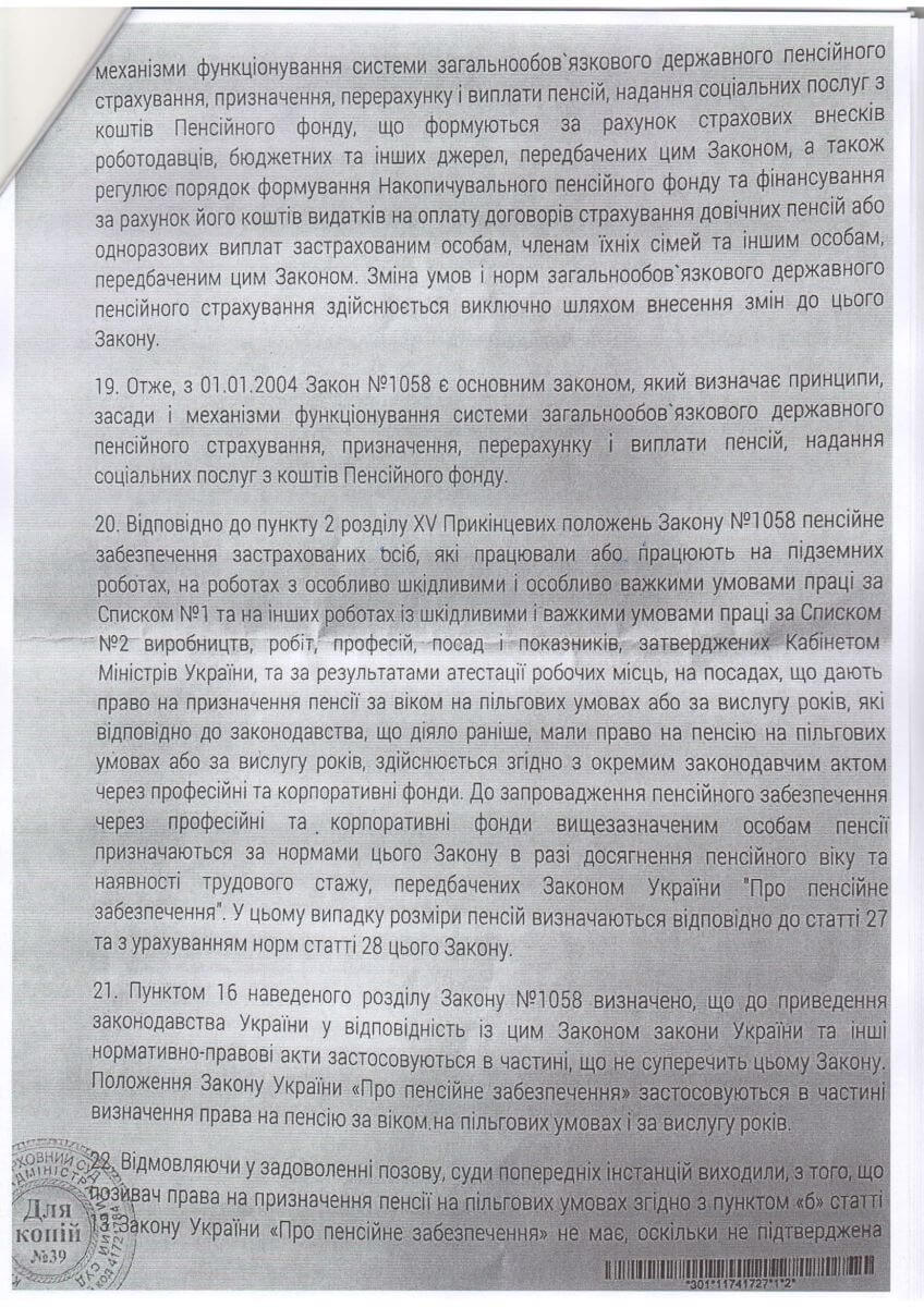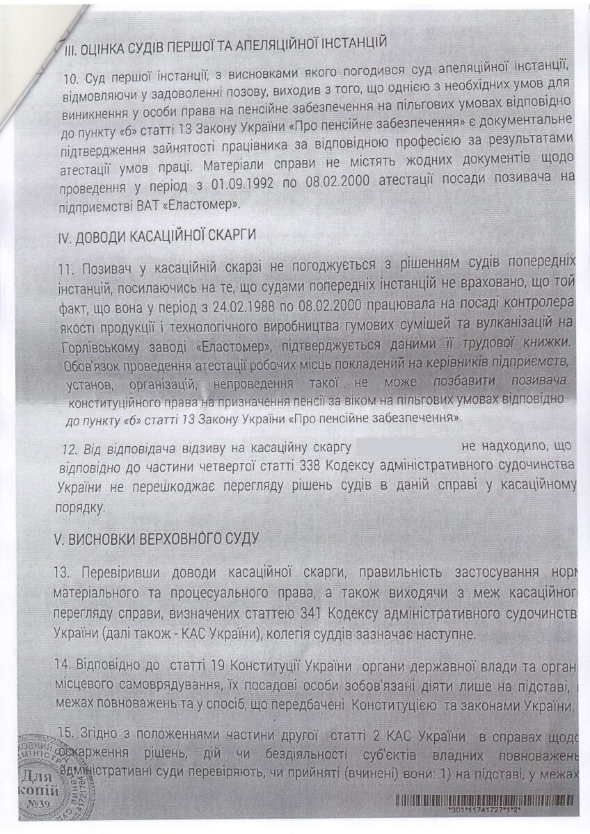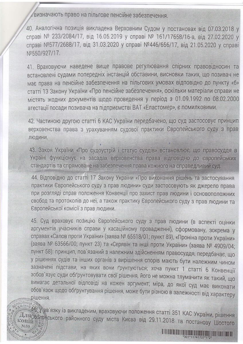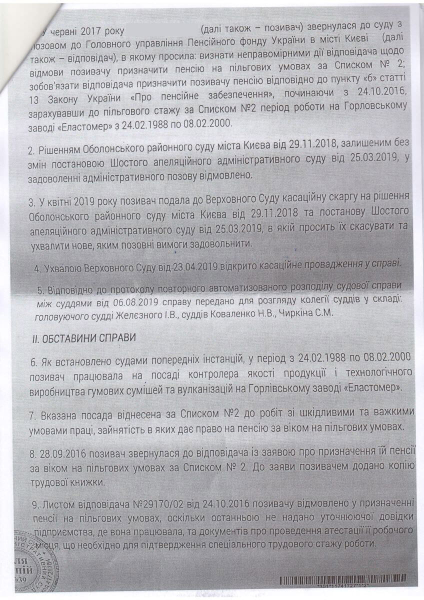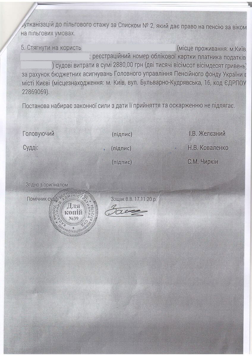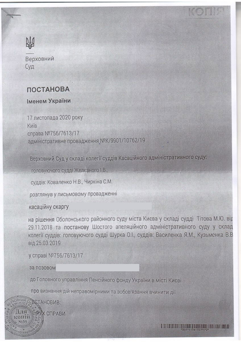 Представляя интересы истца, что проиграл суд первой и апелляционной инстанции, мы продолжили борьбу, и 17.11.2020 года Верховный Суд отменил решения предыдущих инстанций, дело было выиграно, а действия Главного управления Пенсионного фонда Украины в городе Киеве признаны неправомерными.